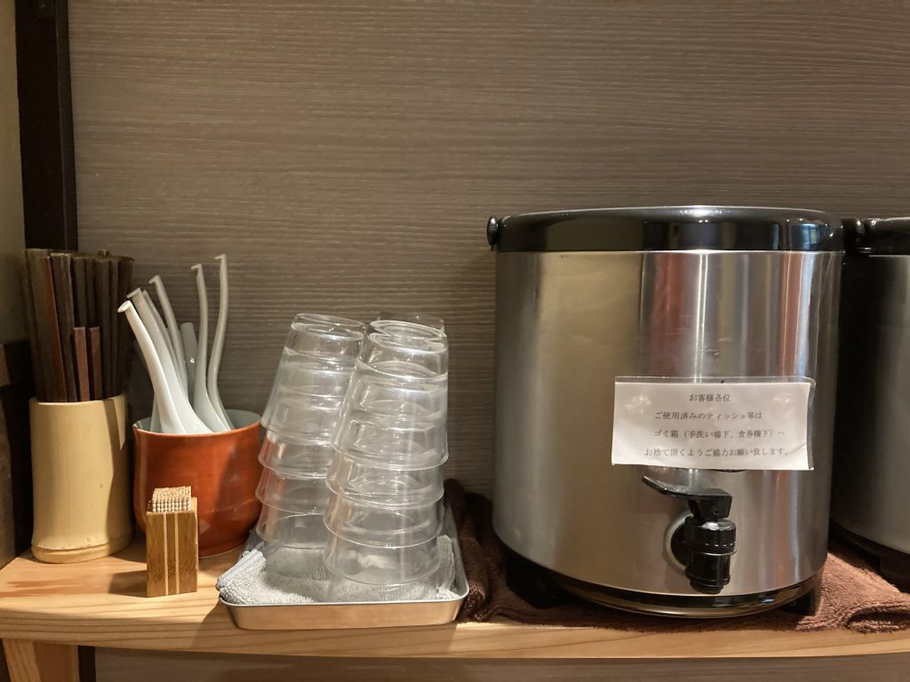 お水などは基本的にセルフサービスですが、席に置いてあるから取りやすいです。